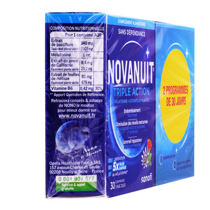 Le laboratoire SANOFI conçoit des compléments alimentaires composés d’ingrédients et de plantes naturels pour améliorer la vie au quotidien à chaque étape de la vie. NOVANUIT Triple action est un complément alimentaire sous forme de comprimés qui contient de la mélatonine hormone du sommeil, sécrétée naturellement par le cerveau, et des extraits de plantes 100% d’origine végétale comme la passiflore, le pavot de Californie et la mélisse pour des actions sur l’endormissement, la diminution des réveils nocturnes et le sommeil réparateur. La mélatonine, à un dosage de 1mg favorise un sommeil normal et participe à s'endormir de façon naturelle. De plus, la mélisse et le pavot de Californie participent à améliorer la qualité du sommeil. La passiflore s’associe à la formule pour favoriser un sommeil réparateur. Ce complément alimentaire permet par sa technologie de libération de libérer 5 fois plus rapidement la mélatonine par rapport à l’ancien comprimé NOVANUIT. Sans accoutumance ni dépendance.