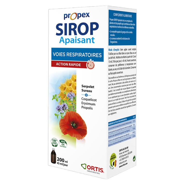 Le sirop PROPEX apaisant est composé d’extraits naturels de propolis, sureau, coquelicot, serpolet, droséra, érysmum et d’huile essentielle de citron. Dans cette formule le serpolet est apaisant et agréable sur la gorge, le pharynx et les cordes vocales et le sureau participe à soutenir les défenses de l'organisme. Il convient à toute la famille dès 3 ans.