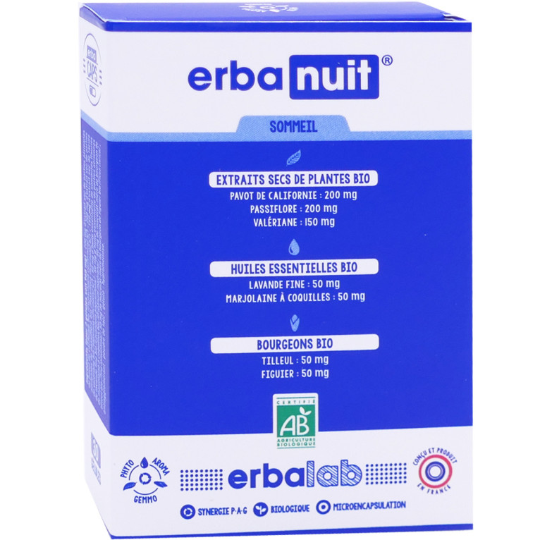 ERBANUIT du laboratoire ERBALAB à prix discount, la solution santé dans votre parapharmacie en ligne à base d’extraits de plantes bio qui facilite l’endormissement et permet de retrouver un sommeil réparateur.