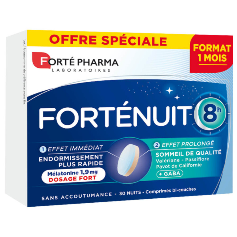 Depuis 1999, les Laboratoires FORTÉ PHARMA développent des compléments alimentaires efficaces et innovants, aux formules issues de la recherche en nutrition cellulaire, pour contribuer aux ressources des utilisateurs. L’univers Santé de FORTÉ PHARMA propose des produits conçus pour préserver le capital santé et se sentir bien au quotidien avec 4 gammes de produits et compléments alimentaires aux Défenses naturelles, au Stress et sommeil, au Bien-être féminin et aux enfants. La mélatonine est une glande qui est sécrétée par le cerveau. Elle a pour fonction de favoriser et réguler les cycles de sommeil. FORTE NUIT 8H est un complément alimentaire à base de 1.9 mg de mélatonine, qui va agir rapidement pour aider à s’endormir plus vite. Il contient également des extraits de plantes (passiflore, valériane, pavot de Californie), du GABA et des vitamines B. La Valériane contribue à une relaxation optimale. Ces comprimés bi-couches innovant permettent d’agir immédiatement et d’agir de façon prolongée tout au long de la nuit pour un sommeil de qualité. Sans accoutumance