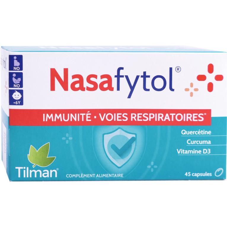 Complément alimentaire à base de : Émulsifiant: polysorbate 80 – Gélatine bovine (tunique) – Humectant : glycérol – Quercétine bioactive 65 mg – Extrait bioactif de curcuma (Curcuma longa) standardisé à 42 mg de curcumine – Cholecalciferol (vitamine D3 2,25 μg, pour quatre capsules par jour : vitamine D3 9 μg, soit 180% VNR*) – Correcteur d’acidité : acide citrique – Eau – Colorants : complexes cuivriques de chlorophylle, oxydes et hydroxydes de fer.