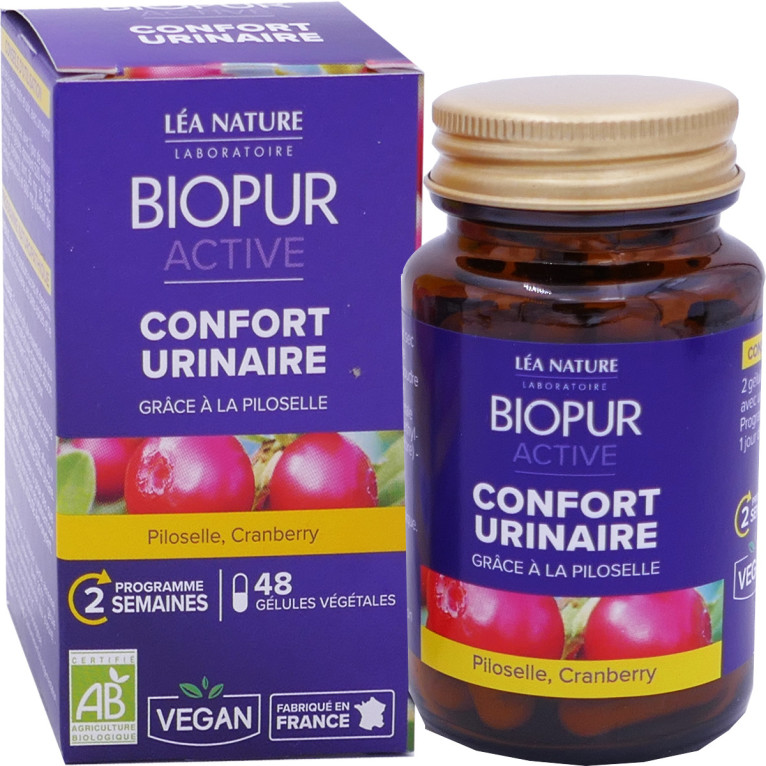 BIOPUR est une marque du laboratoire LEA NATURE composée de compléments alimentaires, super-aliments, thés et infusions fabriqués en France, à base d’actifs naturels et biologiques labellisé AB et vegan. BIOPUR Confort urinaire est un complément alimentaire sous forme de gélules végétales, composé de piloselle (partie aérienne) qui participe au confort urinaire et qui est un dépuratif, stimulant l'élimination de l'eau et des toxines, ainsi que d’extrait de baie de cranberry qui complète la formule.