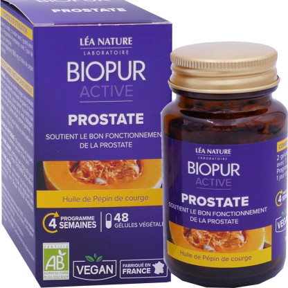 BIOPUR est une marque du laboratoire LEA NATURE composée de compléments alimentaires, super-aliments, thés et infusions fabriqués en France, à base d’actifs naturels et biologiques labellisé AB et vegan. BIOPUR Active Prostate est un complément alimentaire sous forme de gélules végétales, composé d’huile de pépins de courge qui participe au maintien de la fonction prostatique. Ce complément alimentaire Vegan est fabriqué en France.