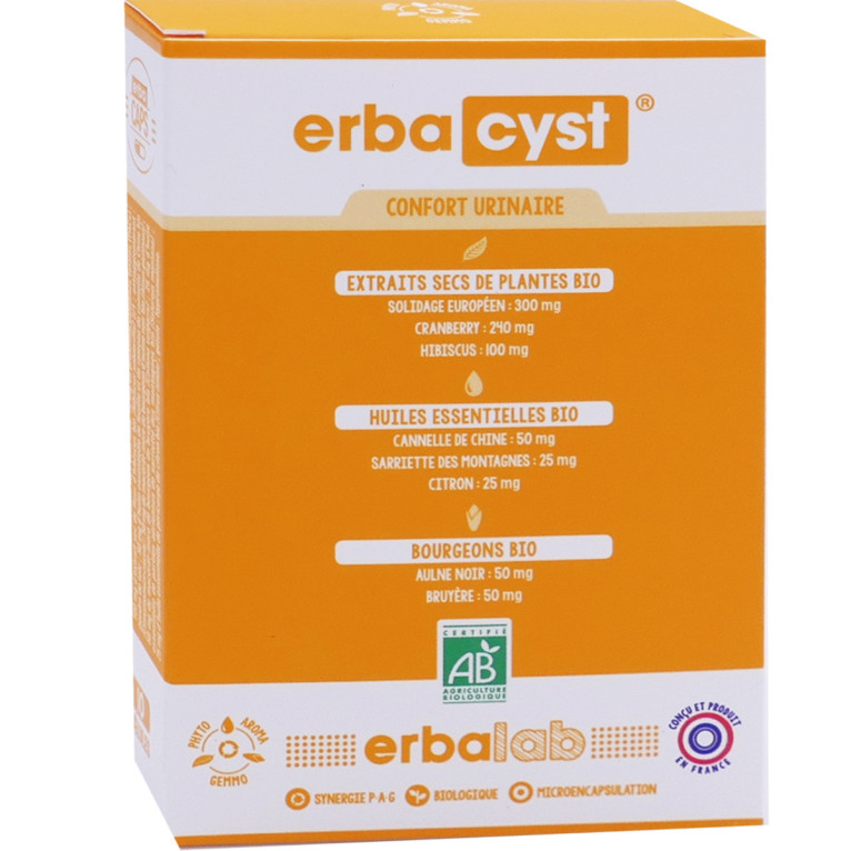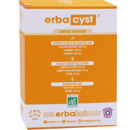 ERBACYST du laboratoire ERBALAB à prix discount, la solution santé dans votre parapharmacie en ligne à base d’extraits de plantes bio conçu pour restaurer le confort urinaire en cas de cystite.