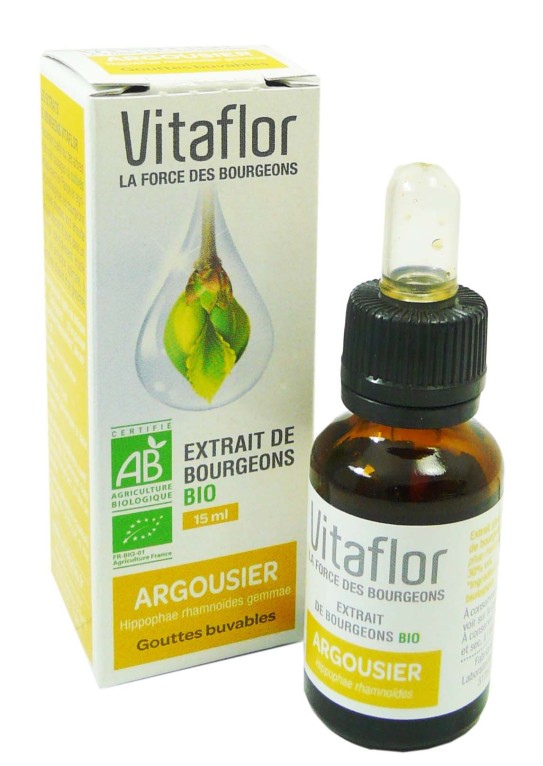 Extrait de Bourgeon bio d’Argousier de VITAFLOR, est un complément alimentaire à base d'extrait de bourgeons issus de l'agriculture biologique française. Le bourgeon d'argousier, qui aide au tonus et l'énergie et à limiter la fatigue.