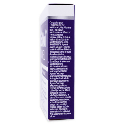 Agent de charge : cellulose ; Extrait de racine de valériane (Valeriana officinalis L.) ; Extrait de feuille de mélisse (Melissa officinalis L.) ; Agent de charge : hydroxypropylméthylcellulose ; Extrait de partie aérienne de pavot de Californie (Eschscholzia califomica cham.) ; Agent de charge : hydroxypropylcellulose ; Agents d'enrobage : hydroxypropylméthylcellulose ; Anti-agglomérant : sels de magnésium d'acides gras ; Agents d'enrobage : hydroxypropylcellulose ; Colorant : spiruline (Spirulina platensis) et pomme (Malus domestica), carthame (Carthamus tinctorius L.) et citron (Citrus lemon), sirop de saccharose, maltodextrine, acide citrique ; Agent de charge : carboxymethyl cellulose sodique réticulée ; Mélatonine ; Vitamine B6 (chlorhydrate de pyridoxine) ; Anti-agglomérant : dioxyde de silicum.