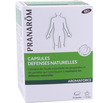 Les capsules Défenses Naturelles Bio Aromaforce de Pranarom à base d'huile essentielle de Gingembre et de Sariette qui participent à maintenir les défenses naturelles, est un complément alimentaire BIO. Elles contiennent : De l’huile essentielle d’Eucalyptus Radié ; De l’huile essentielle de Citron ; De l’huile essentielle de Gingembre ; De l’huile essentielle de Giroflier ; De l’huile essentielle de Sarriette des montagnes ; De l’huile végétale de Colza. Elles peuvent être prises pendant la période délicate à partir de 12 ans.
