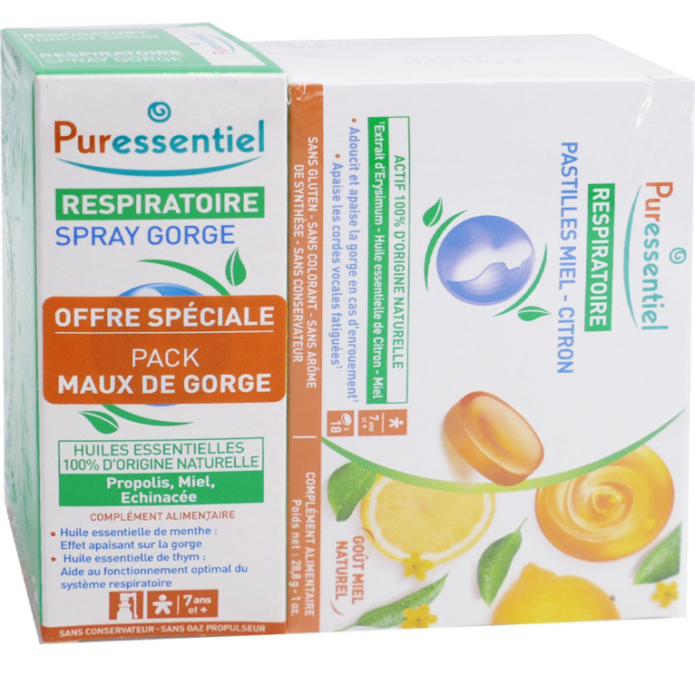 Le Pack Respiratoire discount de PURESSENTIEL, des huiles essentielles et extraits de plantes regroupés dans un spray et des pastilles destinés aux maux de gorge, dans votre parapharmacie en ligne à prix discount. Spray Gorge (15ml) et Pastilles Miel-Citron (18 pastilles).