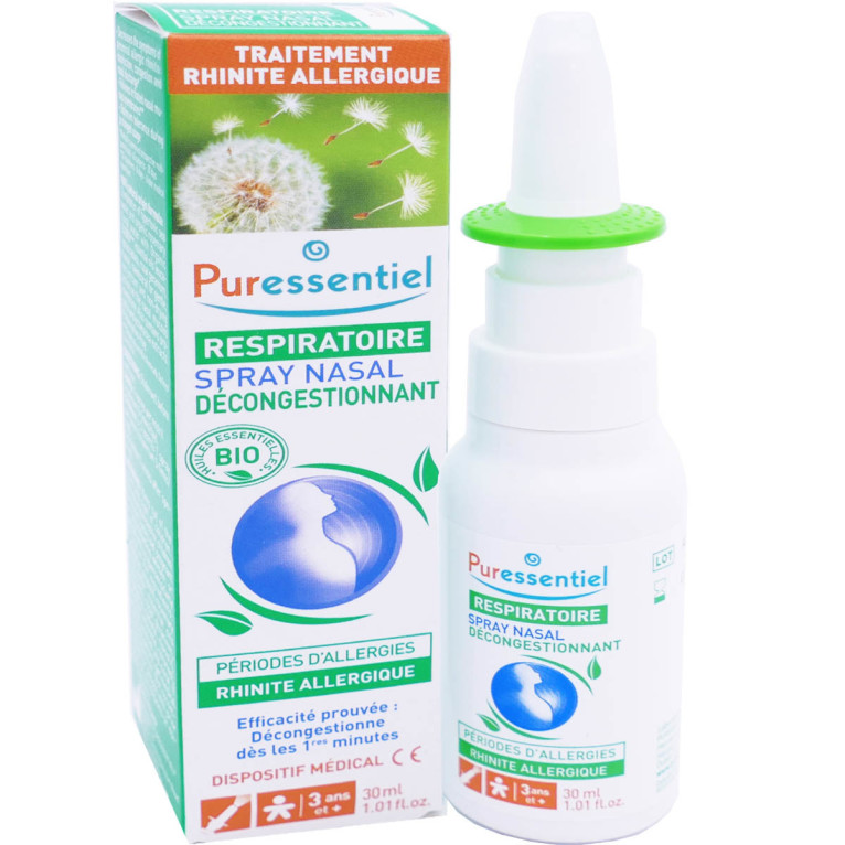 Puressentiel propose un large choix de produits d’aromathérapie et de cosmétique naturelle formulés à base d’huiles essentielles et d’actifs issus de la nature pour contribuer à la santé et au bien-être à l’organisme dans le respect son environnement. La gamme Puressentiel Respiratoire offre des produits formulés à base d’huiles essentielles pour participer au bien-être respiratoire, aider à lutter contre la sensibilité saisonnière. Le Spray nasal décongestionnant de Puressentiel est un dispositif médical qui permet de contribuer à diminuer les symptômes de la rhinite allergique et participe au soulagement de la muqueuse nasale irritée. Sa formule est d'origine 100 % naturelle et est composée d'eau de mer hypertonique, d'eau florale de romarin bio ainsi que d'un mélange d'huiles essentielles bio d'eucalyptus radié, géranium rosat, niaouli et ravintsara. Sa formule contient également des extraits de propolis issu de la ruche et d'échinacée.