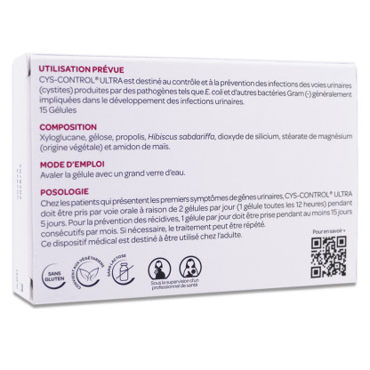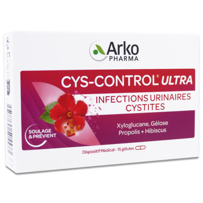 Les laboratoires Arkopharma, experts en phytothérapie, proposent ce dispositif médical en gélules à base de xyloglucane et gélose, combinant hibiscus et propolis. CYS-CONTROL ULTRA est conçu pour gérer et prévenir les infections urinaires (cystites) causées par des agents pathogènes comme E. Coli et d'autres bactéries Gram (+) souvent responsables des infections urinaires.