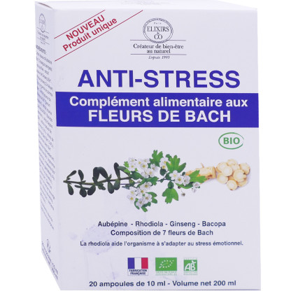 Les Fleurs de Bach sont des élixirs et parfums à base de végétaux naturels pour améliorer le bien-être, retrouver un bon équilibre émotionnel et naturel. Les fleurs de Bach sont élaborées en respectant rigoureusement la méthode originale et l’esprit authentique du Docteur Bach. Anti-stress Complément alimentaire aux Fleurs de Bach d’Elixirs & CO est un complément alimentaire conditionné en ampoules buvable, composé de nombreuses essences de fleurs de Bach (Pommier sauvage, Marronnier blanc, Aigremoine, Chêne, Pin, Verveine, Impatiente) et de plantes (aubépine, ginseng, rhodiola, bacopa). L’Aubépine aide à réduire la nervosité et soutient la fonction cardiaque. La Rhodiola aide l’organisme à s’adapter au stress émotionnel. Le ginseng aide à maintenir la vitalité et contribue à la résistance du corps face au stress. Le Bacopa aide à maintenir l’équilibre mental en cas de stress.