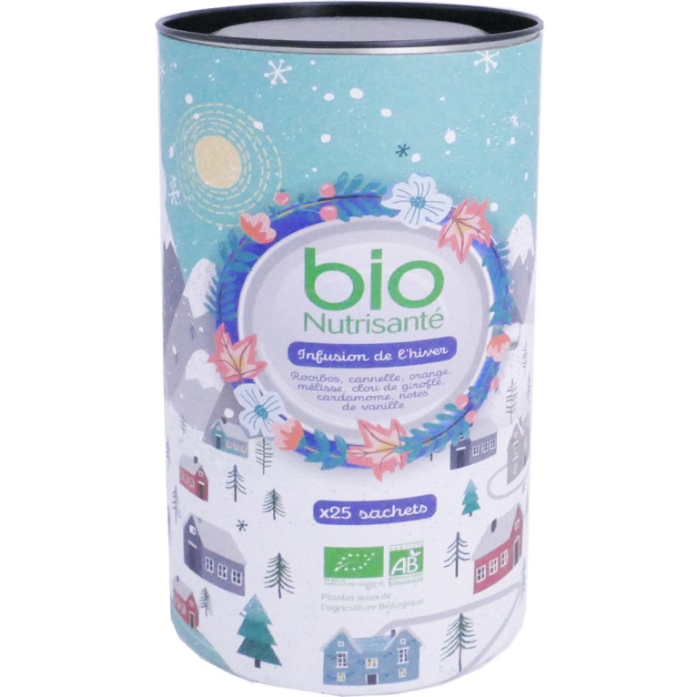 Depuis 1992, Les laboratoires NUTRISANTE proposent aux consommateurs en quête de bien-être des produits innovants, efficaces, naturels et sûrs pour l’organisme à travers des gammes complètes de compléments nutritionnels, tisanes et infusions. Les infusions Nutrisanté 100% d’origine naturelle, sont formulées avec des plantes cultivées conformément aux exigences de l’agriculture biologique, dans le respect de l’environnement et sans utilisation d’OGM. Ces infusions conservent la pureté des plantes et sont garanties sans arôme artificiel. Les sachets-filtres sont élaborés avec du papier non blanchi au chlore et ne possèdent pas d’agrafe afin d’éviter tout phénomène d’oxydation. L’infusion De l’Hiver est conseillée dès l’entrée dans l’hiver pour réchauffer l’organisme. Elle est composée de cardamome, orange, girofle, cannelle et de vanille pour une note de gourmandise !