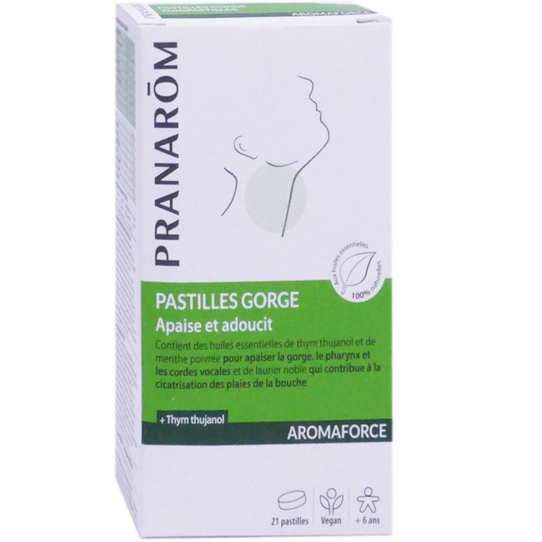 Aromaforce Pastilles Gorge de PRANAROM discount, les huiles essentielles dans votre parapharmacie en ligne à prix discount, dans un complément alimentaire en pastilles avec du thym thujanol et de la menthe poivrée qui aide à apaiser la gorge, le pharynx et les cordes vocales. A partir de 6 ans.