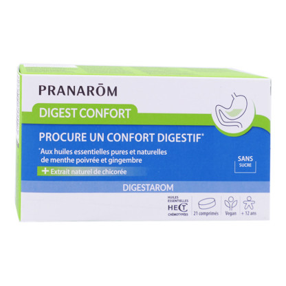 DIGESTAROM Digest Confort discount de PRANAROM, le complément alimentaire en comprimés à croquer à base d’huiles essentielles 100% pures et naturelles, dans votre parapharmacie en ligne à prix discount. A partir de 12 ans