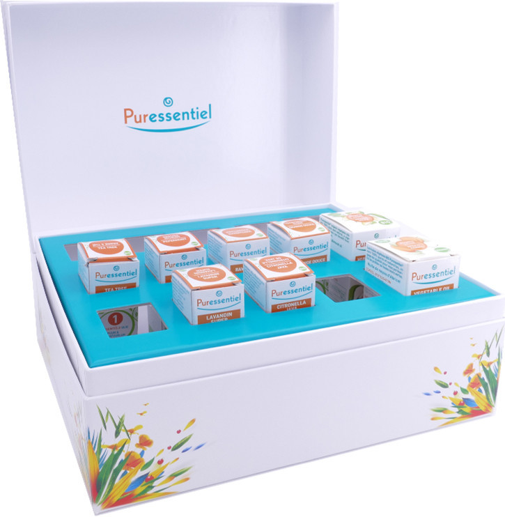 6 huiles essentielles Bio (arbre à thé, citronnelle de java, menthe poivrée, lavandin super, orange douce, ravintsara), 2 huiles végétales bio (amande douce, noyau d’abricot)