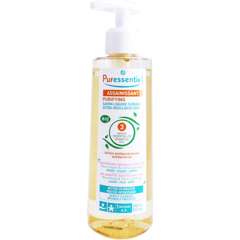 PURESSENTIEL ASSAINISSANT Savon Liquide Surgras Bio discount, 3 huiles essentielles bio pour laver en douceur au quotidien, les mains le visage et le corps de toute la famille, dans votre parapharmacie en ligne à prix discount.