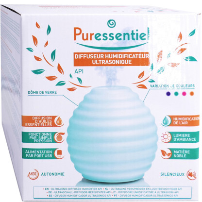 Le Diffuseur Humidificateur Ultrasonique API discount de PURESSENTIEL, un diffuseur à ultrasons pour une ambiance relaxante, tonique ou de détente dans votre parapharmacie en ligne à prix discount, pour parfumer son intérieur par la diffusion des huiles essentielles ou tout simplement humidifier l’air ambiant d’une pièce.