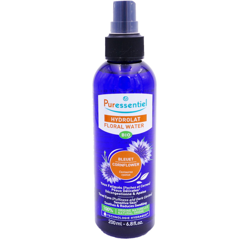 Les HYDROLATS de PURESSENTIEL 100% naturels et bio qui ne contiennent pas de conservateur, prennent soin de toutes les peaux en répondant aux besoins du quotidien (nutrition, hydratation, imperfections, éclat). Obtenus par distillation à la vapeur d’eau des parties de plantes biologiques, ainsi que par la technologie HYDRAQUA, ils permettent de préserver intégralement le végétal et ainsi être efficace naturellement. L’Hydrolat de Bleuet est un soin qui estompe les cernes et les poches sous les yeux en décongestionnant, défatigue et apaise la peau. Le regard est frais et le visage est réveillé.