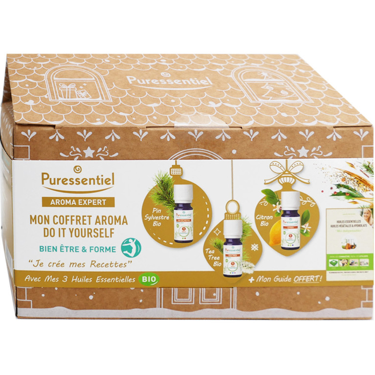 Le Coffret AROMA EXPERT « Mon Coffret Aroma Do It Yourself » Bien-être et Forme discount de PURESSENTIEL, pour procurer confort et bien-être sur l’organisme au quotidien dans votre parapharmacie en ligne à prix discount. Un joli coffret en forme de maison à offrir ou à se faire offrir ! Huile Essentielle Pin Sylvestre Bio (10 ml) ; Huile Essentielle Tea Tree Bio(10 ml) ; Huile essentielle Citron Bio (10 m)l ; Livre Huiles Essentielles Huiles Végétales & Hydrolats "Mes Indispensables"