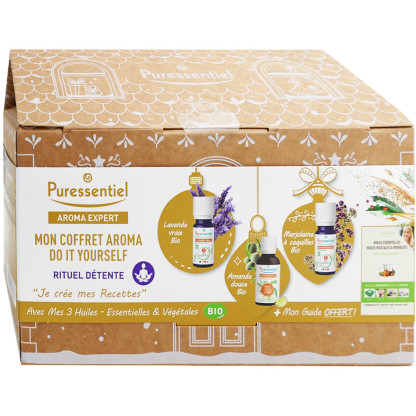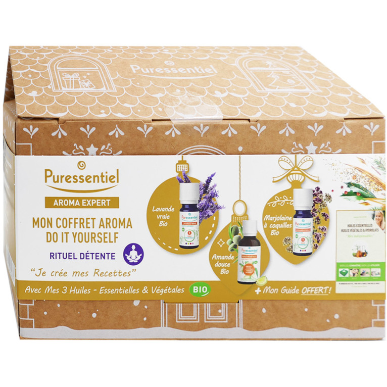 Le Coffret AROMA EXPERT « Mon Coffret Aroma Do It Yourself » Rituel Détente discount de PURESSENTIEL, un joli coffret en forme de maison à offrir ou à se faire offrir contenant Huile Essentielle Lavande Vraie Bio (10 ml) ; Huile Essentielle Marjolaine à Coquilles Bio(10 ml) ; Huile végétale Amande Douce Bio (30 m)l ; Livre Huiles Essentielles Huiles Végétales & Hydrolats "Mes Indispensables" Dans votre parapharmacie en ligne à prix discount.