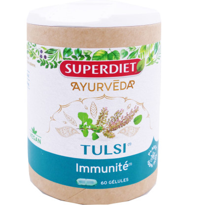 SUPERDIET propose une large gamme de compléments alimentaires à la fois efficaces et sûrs, élaborés avec des plantes issues majoritairement de l’agriculture biologique, pour offrir le meilleur de la nature et apporter des solutions naturelles à tous nos besoins santé et bien-être. SUPERDIET innove avec une nouvelle gamme : AYURVEDA pour proposer à tous et toutes des solutions naturelles inspirées de la médecine ayurvédique issue de la tradition ancestrale indienne. TULSI Immunité est un complément alimentaire conditionné sous forme de gélules composé de Tulsi (ou basilic sacré) qui est une plante sacrée en Inde. Elle va renforcer les défenses naturelles de l’organisme et participer au maintien du confort respiratoire.