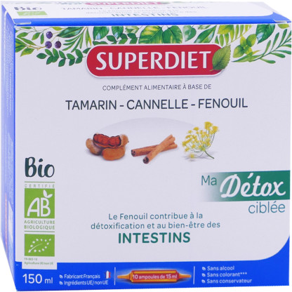 Détox Intestins Bio des laboratoires SUPERDIET, est un complément alimentaire à base de tamarin, qui contribue à réguler le transit, et de fenouil, qui aide à l'élimination. De la cannelle vient s'ajouter à cette formule.