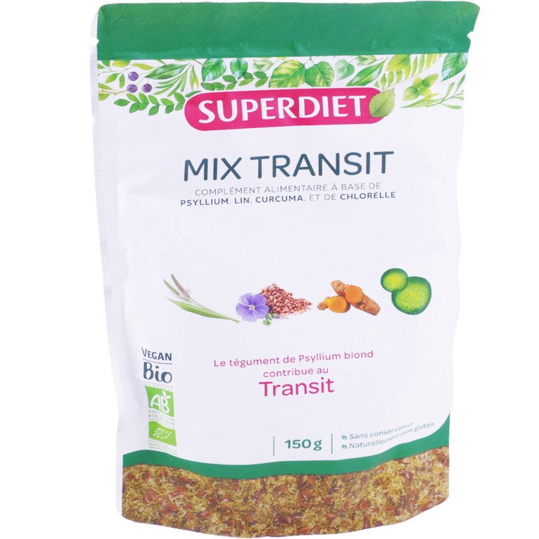 MIX TRANSIT Bio Poudre de SUPERDIE, est un complément alimentaire à base de psyllium et de lin , qui contribue au transit, riches en fibres et en protéines.