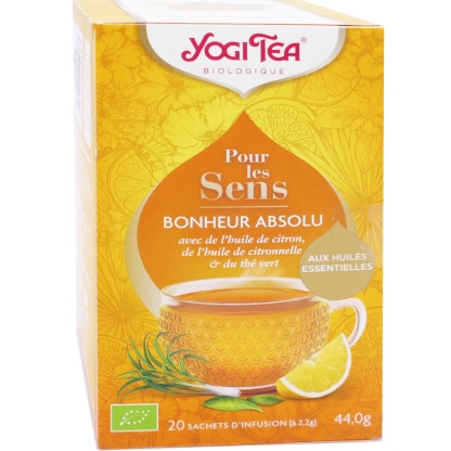 YOGI TEA « Pour les Sens » Bonheur Absolu est un assortiment de plusieurs saveurs. Cet assemblage parfait d’huiles essentielles, de plantes et agrumes au goût et à la saveur unique va satisfaire tous ceux qui veulent pétiller ! La combinaison fruitée et pétillante des huiles essentielles de citronnelle et de citron, du thé vert Sencha et d'un soupçon de gingembre vous feront sourire d'enchantement.