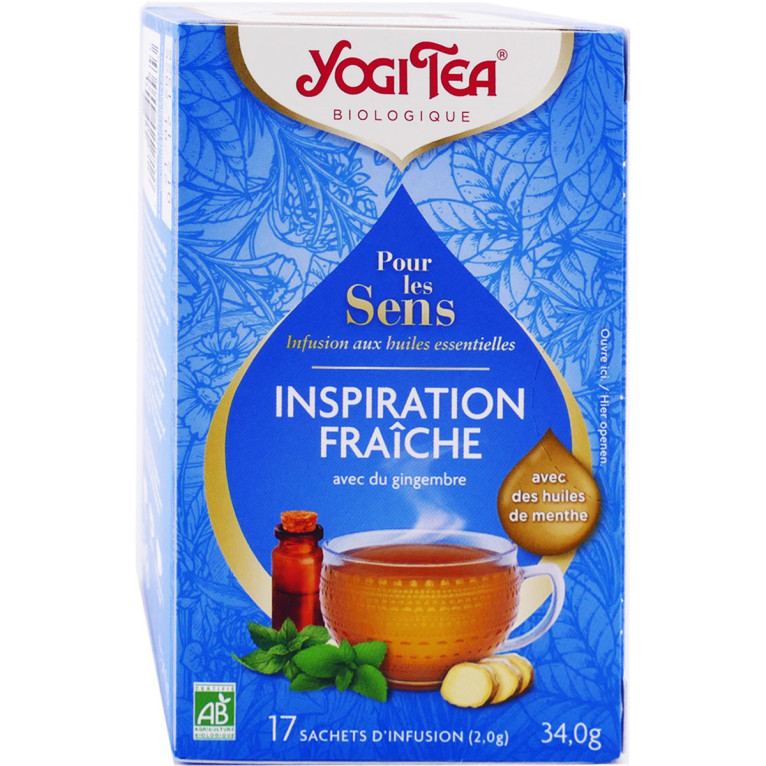 YOGI TEA « Pour les Sens » Inspiration Fraîche est un assortiment de plusieurs saveurs. Cet assemblage parfait d’huiles essentielles et de plantes au goût et à la saveur unique, va satisfaire tous ceux qui veulent se rafraîchir et avoir de nouvelles idées ! Les huiles essentielles de menthe, gingembre aromatique et citronnelle pétillante procureront un moment de fraîcheur ultime !