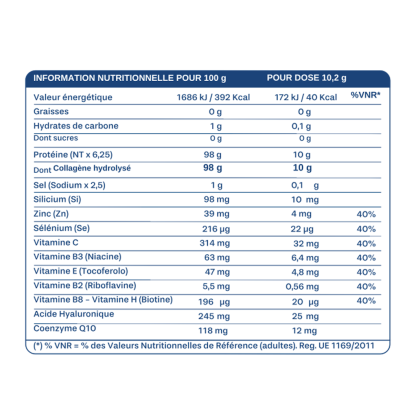 Complément alimentaire à base de : collagène hydrolysé Colpropur D Bovine, vitamine C, gluconate de zinc, extrait de bambou, vitamine E, acide hyaluronique, coenzyme Q10, levure de sélénium, vitamine B3, Stevia, vitamine B2, arôme et vitamine B8.