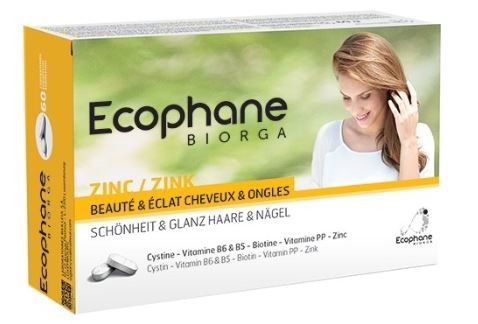 ECOPHANE des Laboratoires BIORGA est un complément alimentaire sous forme de comprimés , qui est formulé à partir de cystine, de vitamine B5 et B6, de biotine qui contribue au maintien de la peau et des cheveux ainsi que de Zinc qui favorise le maintien de cheveux et d'ongles normaux. La vitamine B6 contribue à la synthèse normale de la cystéine et le Zinc contribue également à aider à protéger les cellules contre le stress oxydatif. ECOPHANE de BIORGA est idéal pour la beauté et l'éclat des cheveux et des ongles.