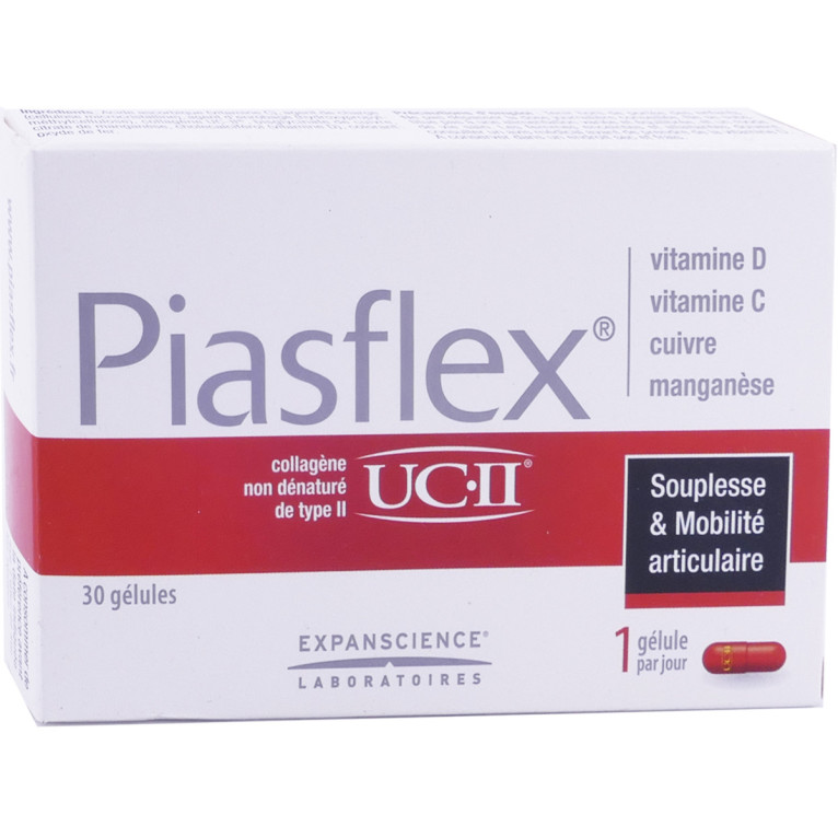 Au fur et à mesure du temps, plusieurs chose peuvent peser sur les articulations (l’âge, le sport, l’excès de poids, la sédentarité, les mauvaises postures,…). Les laboratoires EXPANSCIENCE ont donc mis au point PIASFLEX : un complément alimentaire conditionné sous forme de gélules créé pour apporter du soutien à vos articulations (os, cartilage, tendons, ligaments et muscles) afin de maintenir votre mobilité et votre souplesse. Ces gélules d’origine végétale formulé sans allergène, sans gluten, sans conservateur, sans édulcorant et sans dioxyde de titane, va vous apporter un complexe d’actifs (vitamine c, vitamine d, collagène de type II, cuivre, manganèse) pour pallier aux problèmes d’articulations et de mobilités pouvant freiner les activités quotidiennes basiques.