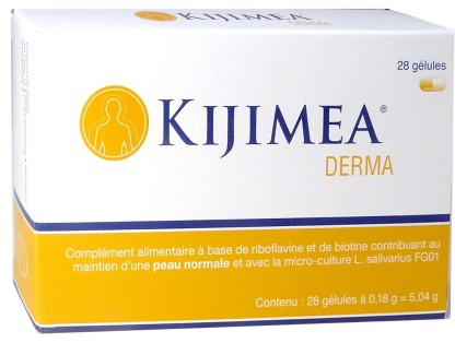KIJIMEA Derma est un complément alimentaire sous forme de gélules, pour redonner à la peau toute sa beauté. Composé de microculture spécifique L. salivarius FG01, de ribflavine et de biotine, la flore intestinale intimement lié à la qualité de la peau sera rééquilibrée pour une fonction normale de la peau, et les problèmes cutanés seront diminués (eczéma, démangeaisons, peau sensible,…). Jour après jour la peau est nette et retrouve sa beauté.
