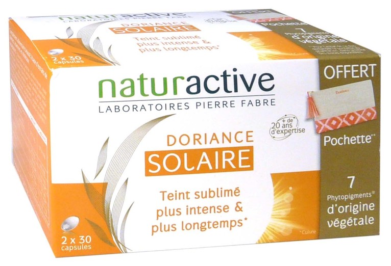 Naturactive des laboratoires Pierre Fabre proposent des solutions de santé naturelles, sûres et efficaces, développées selon une démarche éthique et responsable de la santé et du bien-être. DORIANCE est une gamme de compléments alimentaires et solutions de phytothérapies, formulés à base d’extraits de plantes et d’actif rigoureusement sélectionnés pour sublimer naturellement la beauté de la peau, des cheveux et du corps. DORIANCE Solaire de NATURACTIVE est un complément alimentaire spécialement conçu pour offrir sans procédé chimique, un hâle uniforme et harmonieux sur l’ensemble du corps et protéger la peau des effets néfastes du soleil en combattant le photovieillissement. Sa formule associe 7 phytopigments d'origine naturelle, du paprika, des extraits d'une micro-algue, de l’huile de bourrache, et de la vitamine E antioxydante pour assurer un bronzage sublimé pendant plusieurs semaines, même après l’exposition solaire. Attention : DORIANCE Solaire ne protège pas des rayons UV du soleil, il est indispensable d’utiliser une crème protectrice solaire adaptée.