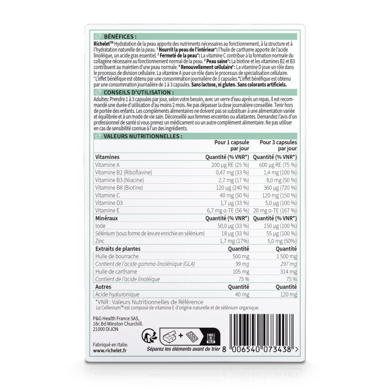 Hydratation de la Peau discount du laboratoire RICHELET, un complément alimentaire en capsules à base d’huiles végétales, vitamines et minéraux pour une belle peau naturellement, dans votre parapharmacie en ligne à prix discount.