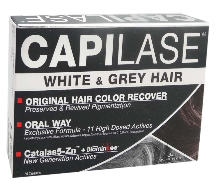Capilase White & Grey des laboratoires Les 3 CHENES est un complément alimentaire sous forme de gélules. Sa formule est composée de 11 ingrédients dont 2 exclusifs : BiaminoeeTM et le complexe Catalas5-ZnTM. La catalase est associée au zinc qui contribue à protéger les cellules contre le stress oxydatif, au sélénium favorise le maintien de cheveux normaux, et au cuivre qui participe à la pigmentation normale des cheveux.