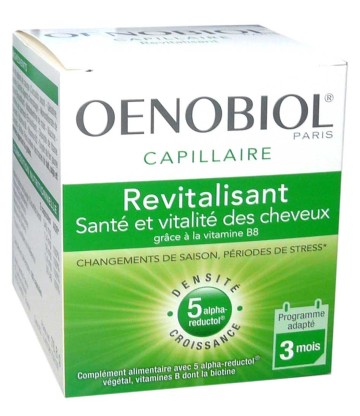 OENOBIOL capillaire Revitalisant est un complément alimentaire conditionné sous forme de capsules à base d’actifs ayant la capacité de normaliser la chevelure pour apporter aux cheveux vigueur et beauté lors de chevelure fatiguée ou dévitalisée qui peut être causé par les changements de saison. OENOBIOL capillaire Revitalisant contient un complexe 5-alpha-réductol végétal à base d’huile de pépins de courge et des vitamines B1, B2, B3, B5, B6 et B8 (biotine) dont l’association va participer à la beauté du cheveu, et redonner brillance et vitalité aux cheveux.