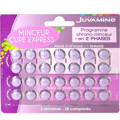 Le laboratoire JUVAMINE du groupe laboratoire Juva Santé, conçoit des compléments alimentaires, infusions, vitamines,… pour le bien-être au quotidien de toute la famille (tonus, bio, minceur,…) Minceur Cure express est un programme minceur sur 3 semaines qui se répartit en 2 phases, pour permettre d’agir sur les graisses, le sucre et la perte de poids. La phase d’attaque sur la première semaine du régime, agira sur la diminution des kilos superflus et sur le programme hypocalorique, tandis que la phase de stabilisation sur la deuxième et troisième semaine de la Cure express permettra de stabiliser la perte de poids. Ce complément alimentaire va agir sur l’amincissement grâce aux extraits de plantes (maté, guarana, queue de cerise) ainsi qu’au fer. Minceur Cure express va brûler les graisses pour limiter leur stockage en participant à son bon métabolisme, drainer afin d’éliminer l’eau en excès dans l’organisme, participer au bon métabolisme énergétique pour redonner du tonus, et diminuer la fatigue qui peut survenir lors d’un régime. Très rapidement les résultats sont visibles : perte de poids et stabilité à long terme.