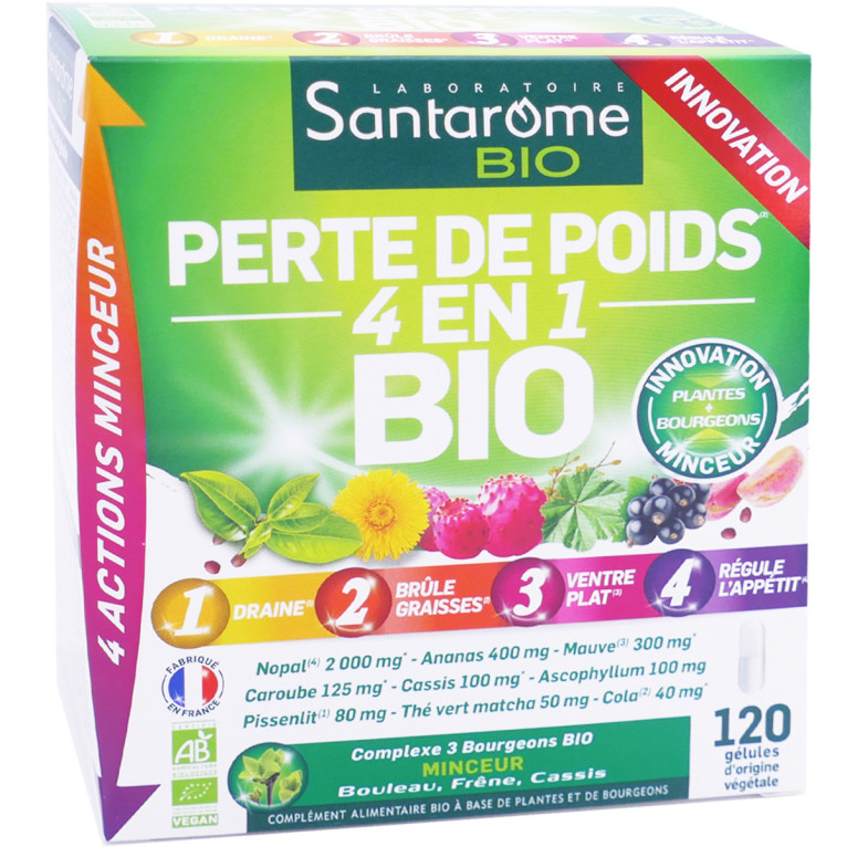 Perte de Poids 4 en 1 est un complément alimentaire conditionné en gélules d’origine végétale. Sa formule est composée d’un trio de bourgeons Bio (Bouleau, Frêne Cassis) associé à diverses plantes : Pissenlit, Nopal, Thé Vert, Caroube, Noix de Cola, et Mauve. Dans cette formule le cassis est utilisé pour favoriser l'élimination rénale de l'eau, le cola aide à brûler les graisses et à soutenir l'amincissement. Enfin la Mauve contribue au confort digestif et le Nopal aide à diminuer l'appétit ainsi qu'à contrôler le niveau de glucose.
