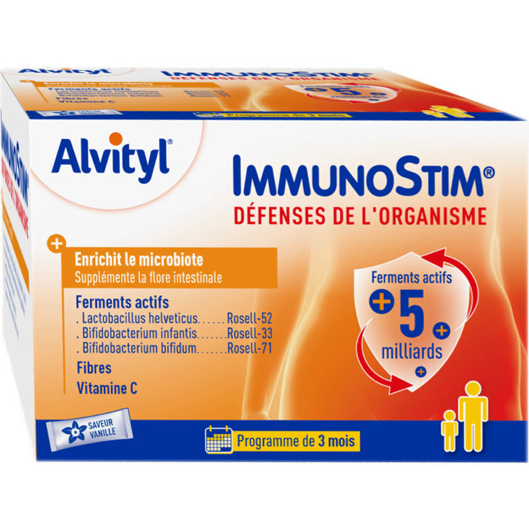 Le laboratoire URGO conçoit des produits pour le soin des mains, des pieds, des plaies cutanées et buccales, des vitamines,...ImmunoStim est un complément alimentaire sous forme de sticks, composé de 3 ferments actifs (Lactobacillus helveticus, Bifidobacterium infantis et Bifidobacterium bifidum), de fibres (Fructo-oligosaccharides). La formule contient également de la vitamine C qui contribue au fonctionnement normal du système immunitaire. Elle permet également de contribuer à réduire la fatigue.Le goût vanille des sticks facilitera la prise d’ImmunoStim.