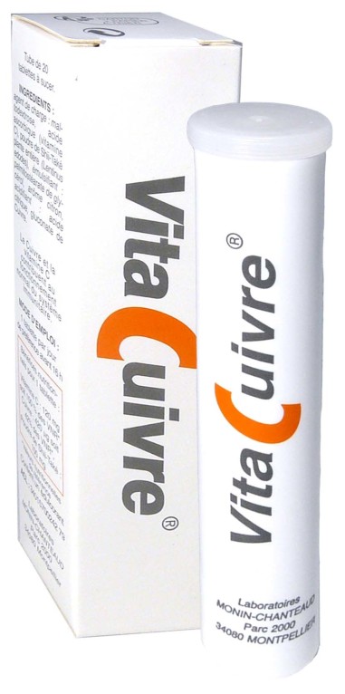 VITACUIVRE élaboré par les laboratoires MONIN CHANTEAUD est un complément alimentaire d'apport de cuivre et de vitamine C qui participent à la fonction immunitaire normale. Il est conditionnée en tube de 20 tablettes à sucer. Chaque tablette apporte à votre organisme 150 % des valeurs nutritionnelles de références de Vitamine C.
