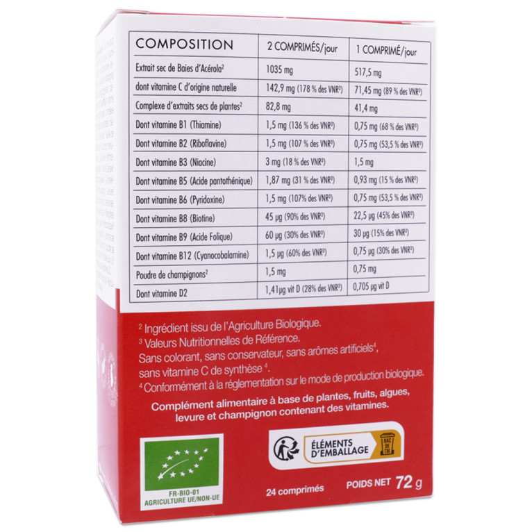 Sucres Issus De Canne* (Sucre Roux*, Sucre Mi-Blanc2), Maltodextrine*, Extrait Sec D'acérola* (Malpighia Glabra), Antiagglomérant : Carbonates De Magnésium, Arôme Naturel Fruits Rouges*, Complexe D'extraits Secs De Plantes*, D'algues* Et De Levure* : Feuille Basilic Sacré* (Ocimum Tenuiflorum L.), Spiruline* (Arthrospira Platensis ), Fruit De Goyave* (Psidium Guajava), Chlorelle* (Chlorella Vulgaris ), Levure* (Saccharomyces Cerevisiae), Fruit De Mangue* (Mangifera Indica), Graine D'haricot Azuki* (Vigna Angularis), Écorce De Citron* (Citrus Limon), Poudre De Champignons* Traitée Aux Uv Contenant De La Vitamine D2. *Ingrédients Issus De L'agriculture Biologique.