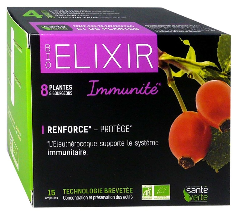 Le laboratoire SANTE VERTE propose des compléments alimentaires à base de plantes, vitamines,… pour le bien-être et les besoins au quotidien. ELIXIR Bio Immunité est un complément alimentaire sous forme d’ampoules incassables et écologiques, composé d’extraits végétaux obtenu par lixiviation (dont le ginseng), bourgeons de plantes, et de distillat pour stimuler l’organisme et ses défenses naturelles, protéger des infections et virus par ses propriétés anti infectieuses à large spectre, stimuler l’immunité lors d’hypo-gammaglobuline, redonner du tonus et lutter contre la fatigue. L’organisme et ses défenses naturelles renforcées, il sera plus résistant face aux virus et infections.