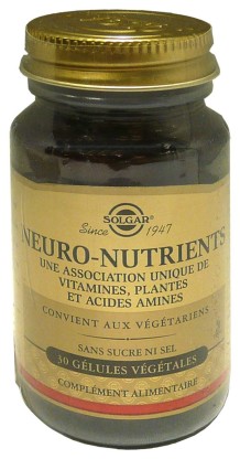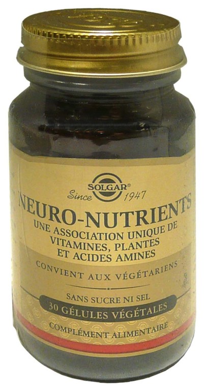 NEURO-NUTRIENTS de SOLGAR, le complément alimentaire à prix discount, la qualité SOLGAR en gélules végétales dans votre parapharmacie en ligne à prix discount, une association de vitamines, plantes et acides aminés. Flacon de 30 gélules.