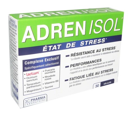 Les 3 CHENES (3C PHARMA) proposent des produits pour le bien-être et la santé de toute la famille à base d’actifs naturels et biologiques. Adrenisol est un complément alimentaire sous forme de gélules, composé d’extraits secs de plantes (dont le basilic sacré et la rhodiola) de vitamines (dont la B6), de magnésium, de taurine et d’hydrolysat de protéine de lait. Cette formule issue de la recherche 3C PHARMA, va permettre de résister au stress, apaiser et détendre le mental pour passer les épreuves stressantes en toute sérénité, tout en favorisant les bonnes fonctions psychologiques et les performances, ainsi qu’en redonnant de l’énergie. Rapidement tout stress est oublié pour retrouver détente et sérénité.