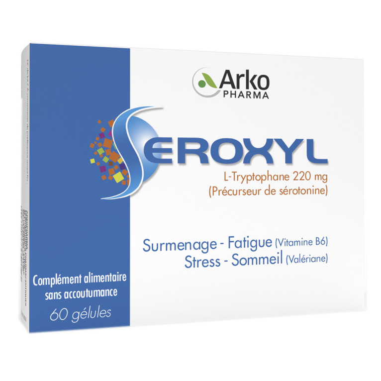 Séroxyl est un complément alimentaire en gélules composé de L-Tryptophane, de vitamine B6 et d'extraits de valériane. Dans cette formule la valériane aide à maintenir un sommeil naturel et participe à soutenir le calme en cas d'irritabilité. La vitamine B6 quant à elle contribue au fonctionnement normal du système nerveux ainsi qu'à réduire la fatigue.