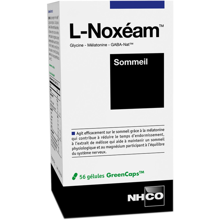 Les laboratoires NHCO Nutrition développent des compléments alimentaires à base d’acides aminés d’origine non animale qui sont essentiels pour le bon fonctionnement de l’organisme. Les laboratoires sont spécialiste de l’Aminoscience pour associer les acides aminés et ainsi concevoir des compléments alimentaires dans différentes gammes Santé pour le bien-être de l’organisme : Dermatologie ; Minceur ; Performance ; Nutricosmétique. L- NOXEAM conditionné sous forme de gélules GreenCaps est un complément alimentaire formulé à base de 3 complexes à base d’acides aminés et plantes (complexe Physio MGO, Complexe RSBS, complexe GABA-Nat) qui contiennent des acides aminés (dont la glycine, le L-Tryptophane, la L-thénanine), de l’extrait de mélisse, de la mélato (hormone du sommeil) et du magnésium. Il diminue le temps d’endormissement, participe aux bonnes fonctions physiologiques et au fonctionnement normal du système nerveux, diminue la fatigue, favorise l’apaisement et la quiétude, pour éliminer stress, anxiété, baisse de moral, et améliore la qualité du sommeil. Convient aux végétariens et aux végétaliens.