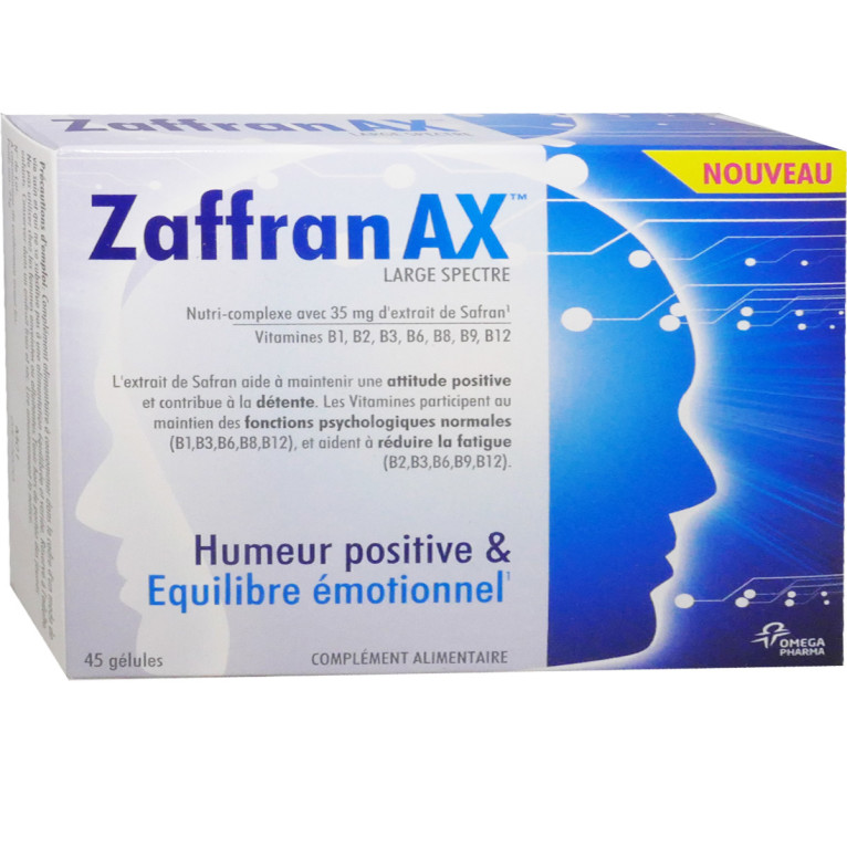 OMEGA PHARMA a mis au point ZAFFRAN AX. Grâce à son Nutri-Complexe unique combinant l’extrait de Safran et des vitamines B1, B3, B6, B8 et B12, ce complément alimentaire vous apporte une aide efficace pour maintenir un état émotionnel normal. ZAFFRAN AX va contribuer à maintenir une bonne humeur, diminuer la fatigue, participer au fonctionnement normal du système nerveux, aider à la concentration et vous aider à résister au stress dans vos moments émotionnellement difficile (irritabilité, émotivité,…).