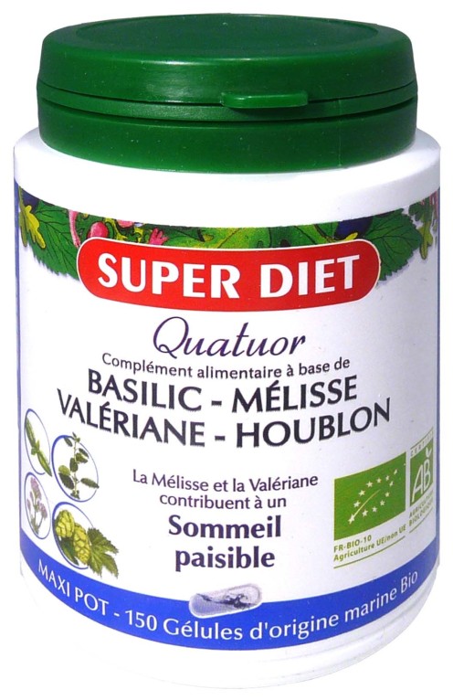 Quatuor Sommeil Paisible de SUPER DIET, est un complément alimentaire à base valériane, qui aide à l'apaisement et la détente, et la mélisse, qui contribue à une relaxation normale. Viennent s'ajouter à ce complément alimentaire du basilic et du houblon.