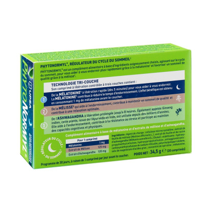 Les comprimés de PHYTONORMYL SOMMEIL contiennent une technologie tri-couches qui permet une libération progressive des principes actifs tout au long de la nuit. Ce complément alimentaire contient de la mélatonine à libération rapide qui peut vous aider à vous endormir en seulement 5 minutes. La mélatonine est connue pour réduire le temps d'endormissement*. En plus de cela, il y a de la mélisse qui aide à l'endormissement, maintient un sommeil de qualité et favorise une relaxation optimale. Pour une libération prolongée jusqu'à 8 heures, il y a également de l'ashwagandha, également appelée ginseng indien, qui est utilisée depuis des milliers d'années dans l'Ayurveda en Inde. Cette plante aide à l'endormissement, renforce la résistance au stress et contribue au maintien des capacités cognitives et physiques. Grâce à UPSA PHYTONORMYL SOMMEIL 30 COMPRIMES, vous retrouverez un sommeil réparateur et une sensation de pleine forme dès le réveil.